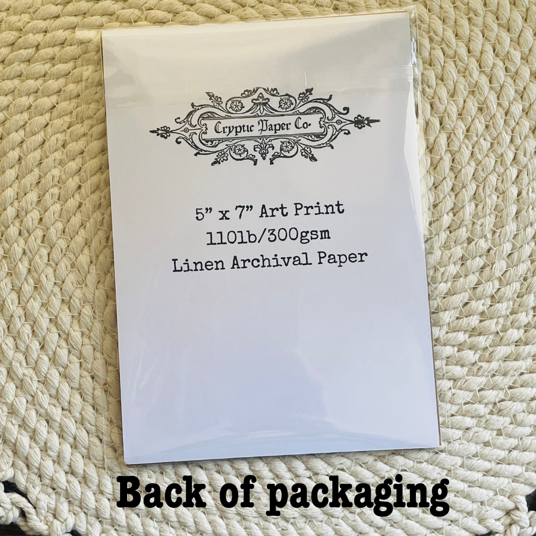 Packaged in a clear, acid free, sealed sleeve with a corrugated cardboard slip to protect it from damage, and product details on the back of the package. Large 9”x12” print - Printed on 110lb / 300gsm Archival Linen Stock - Please note that there is no UPC barcode on this handmade product