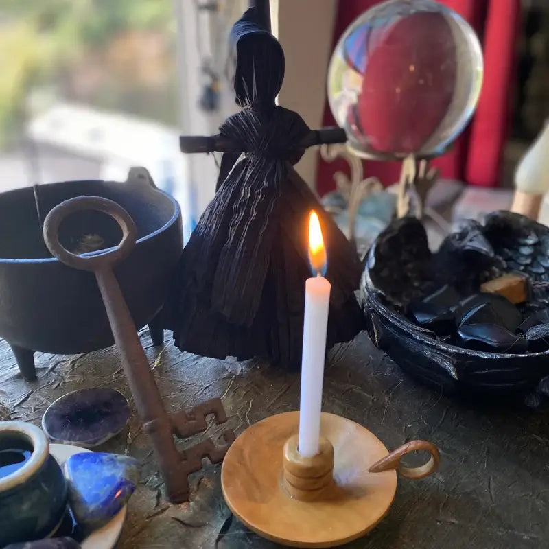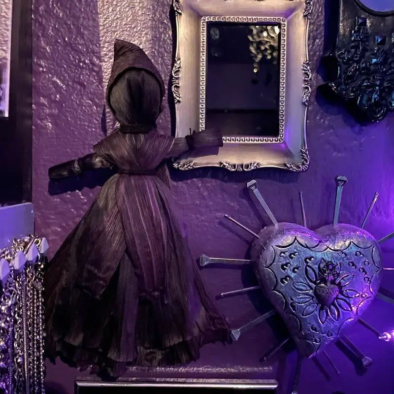 These dolls are made with natural corn husks that are dyed black & wrapped with black twine, each measuring about 6-7" tall & 3" wide. They are adorned with a smock & hood also made with black dyed corn husks, pants styles. Since these dolls are handcrafted from natural materials, the exact size & look will vary slightly per doll. Each doll will also include a small information card with the following (please note if you do not want the information card included): The Corn Husk Doll symbolizes the spirit of the corn & the great harvests. It represents the Maiden as a symbol of fertility, vitality, the natural cycle of life, death, & rebirth much like the cycle of crops & the seasons. The Corn Husk Doll can also be used for ritual purposes & sympathetic magic, & for seasonal altar decor.