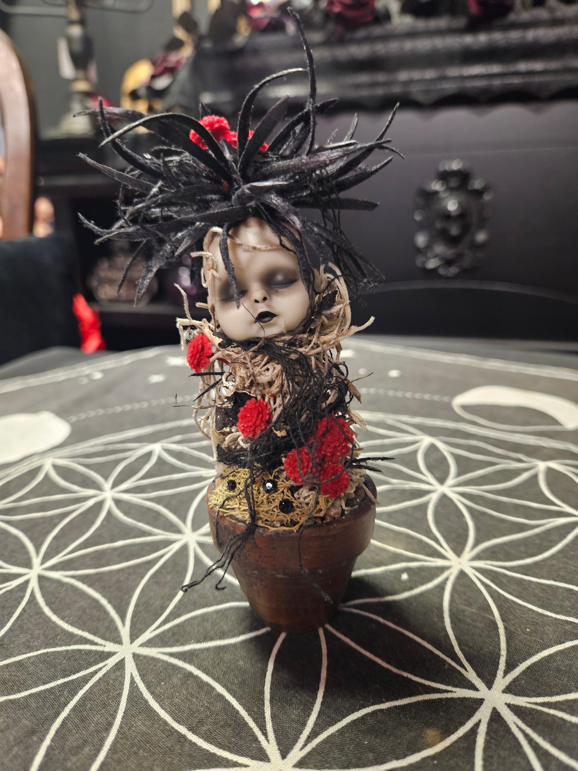 Unsettling ceramic doll heads emerge from lush moss and verdant foliage, transforming macabre visages into unexpected vessels for living plants. Each Creepy Doll Sprout marries dark whimsy with botanical intrigue—a haunting yet enchanting accent for those drawn to the occult aesthetic. Perfect for gothic gardens, altar displays, or shadowed shelving, these sculptural planters invite nature's growth to soften their eerie charm. A conversation piece that whispers of forgotten rituals and untamed magic.