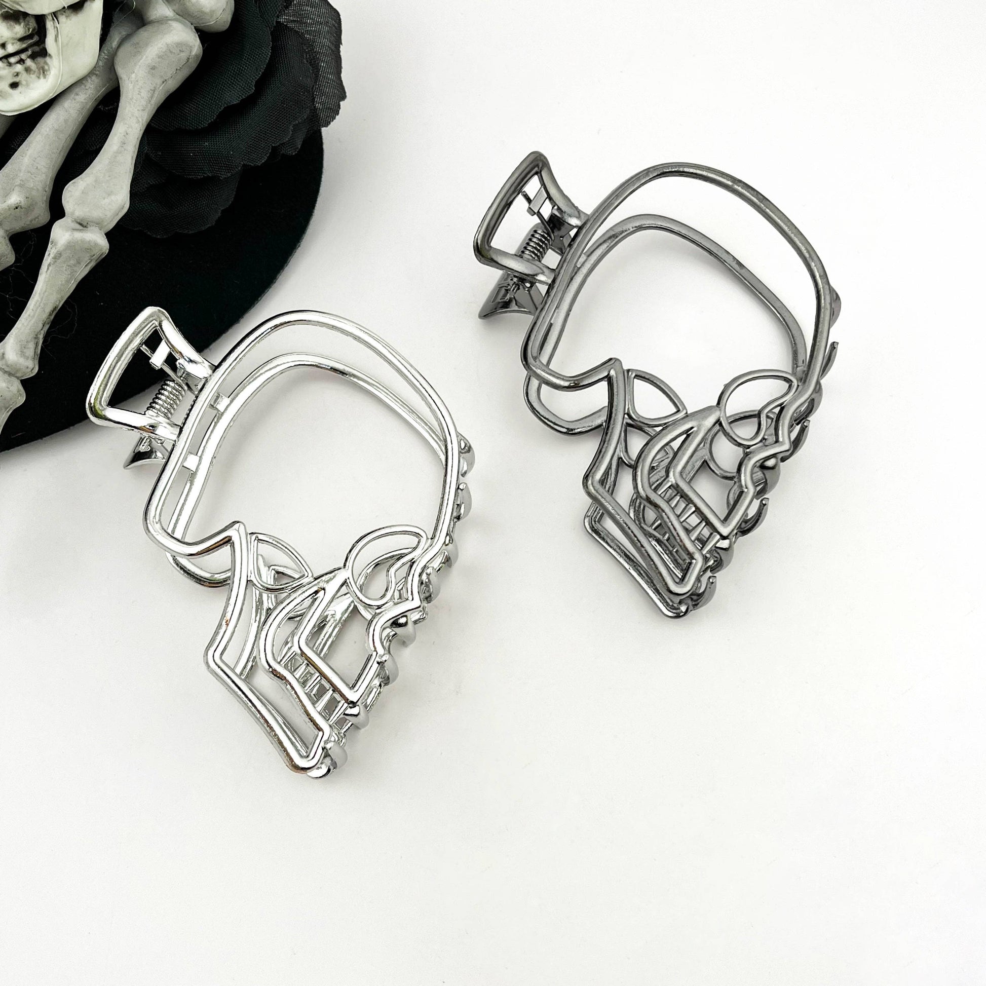 Embrace your darker aesthetic with this haunting skull hair claw, where gothic elegance meets practical styling. The intricately carved skull silhouette channels an air of mystery and rebellion, transforming an ordinary hair accessory into a statement piece. Crafted from resilient material with an assured hold, it glides effortlessly through your locks while maintaining that coveted edge. Whether summoning spirits at midnight gatherings or channeling your inner enchantress through daily wear, this lightweight claw whispers tales of the unconventional. Perfect for those who dare to defy convention and celebrate the shadows within their style.