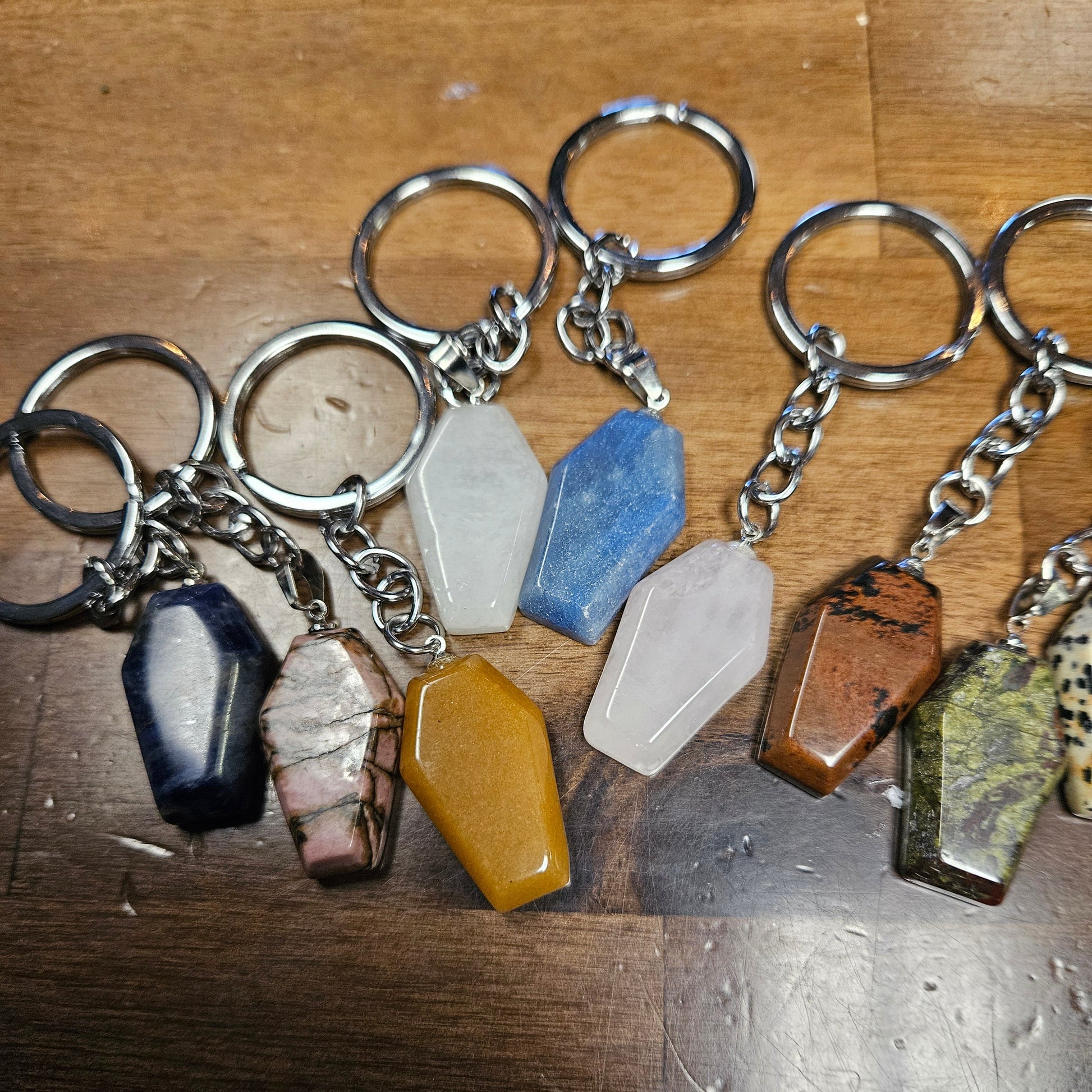 Carry a touch of dark elegance wherever you wander. This mystical keychain features a genuine natural crystal carved into an enchanting coffin shape, a symbol of transformation and the mysteries that lie beyond. Each stone is unique, bearing its own natural variations and energetic signature. Perfect for those who embrace the unconventional and seek to keep a piece of otherworldly beauty close at hand. A subtle yet striking accessory for the spiritually inclined.