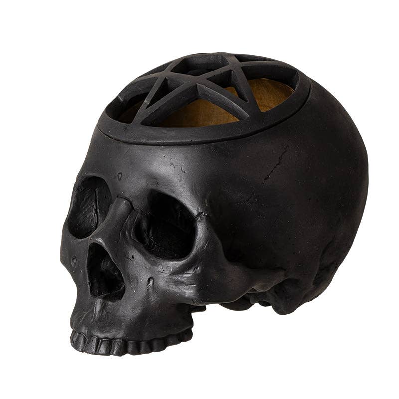 Crafted from cold cast resin, this striking pentagram skull stands 5 inches tall and measures 6.5" wide by 4.75" deep. A mesmerizing fusion of occult symbolism and skeletal artistry, it commands presence on any altar, shelf, or sacred space. Perfect for collectors of dark spirituality and those drawn to esoteric aesthetics.