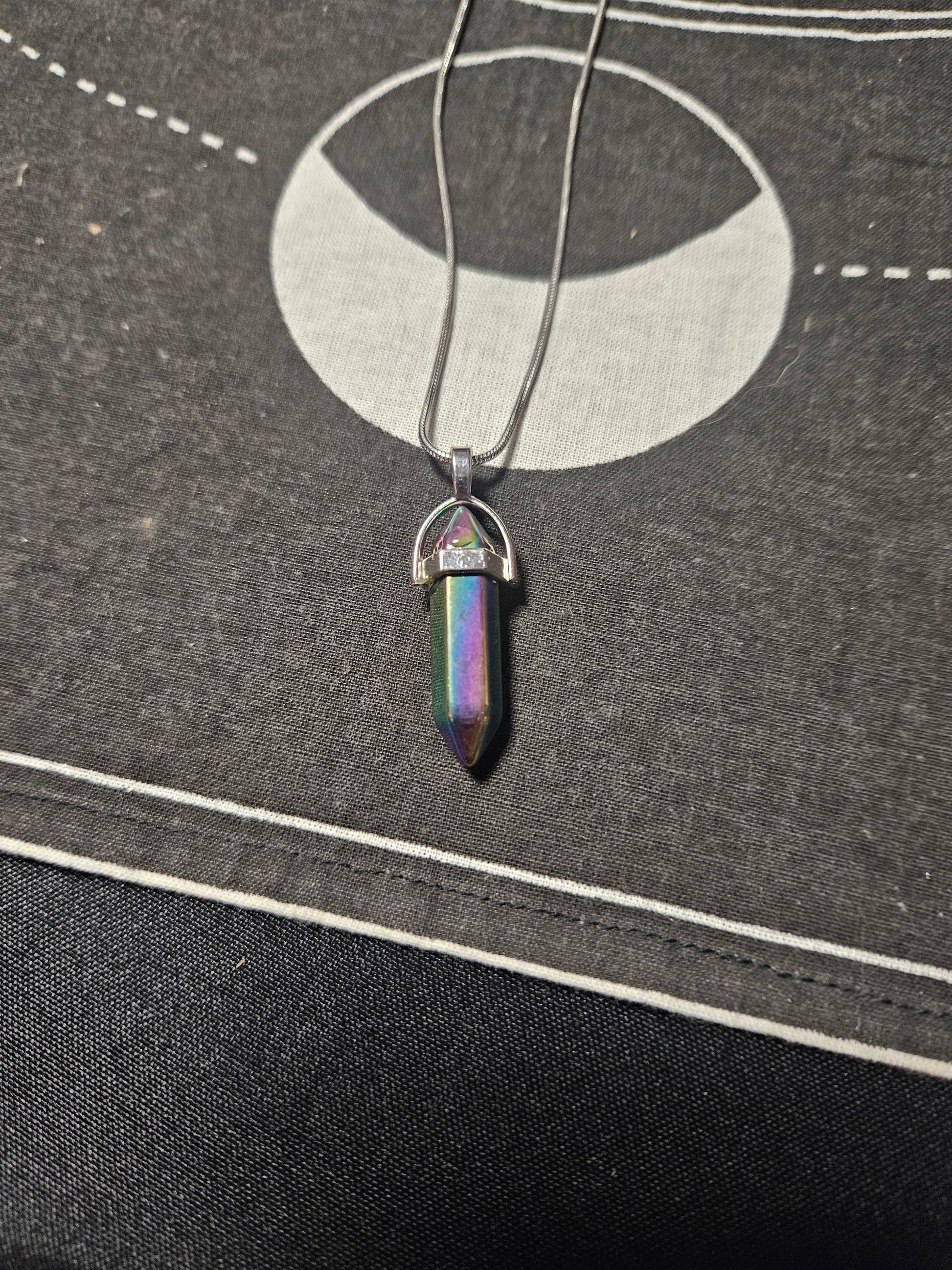 Rainbow Hematite Crystal Point Silver Necklace Adorned with a striking rainbow hematite crystal point suspended from gleaming silver, this necklace channels the grounding essence of hematite while embracing the transformative energy of its iridescent hues. Revered in metaphysical traditions for its ability to anchor the spirit and shield the wearer from negative influences, rainbow hematite amplifies these protective qualities with the added vibrancy of its prismatic colors—each shimmer believed to enhance balance and elevate spiritual awareness. A wearable talisman for those seeking both earthly stability and ethereal connection, this piece merges ancient crystal wisdom with contemporary elegance.