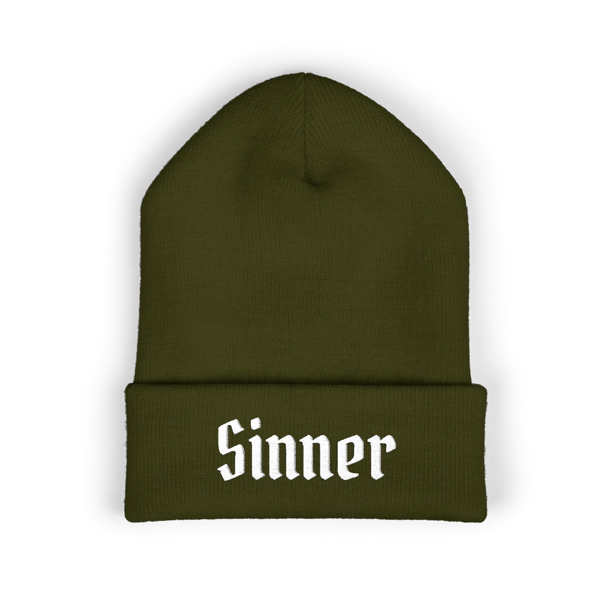 This embroidered cuffed beanie brings a bold, streetwise edge to cool-weather outfits. The olive knit and gothic "Sinner" stitch read like a quiet declaration — worn by someone who prefers attitude over trends. It’s soft against the skin, snug with stretch, and carries a lived-in, downtown energy: mornings grabbing coffee, late-night walks under sodium lights, layering with a worn denim jacket. The cuffed height gives room for the embroidery to stand out without shouting, and the muted color keeps the look grounded and easy to pair. For people who speak in music, verse, and worn leather, this beanie becomes part of the uniform on colder days and nights.