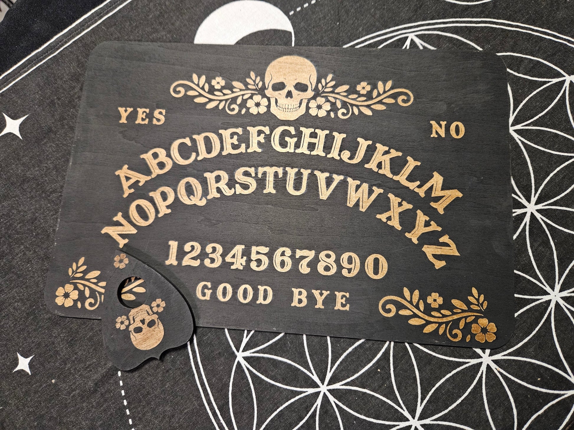 Summon the spirits with this hauntingly beautiful Ouija board, where delicate flowers intertwine with an intricate skull design. Expertly engraved onto premium basswood, this 12x8 piece merges the ethereal and the macabre into a mesmerizing divination tool. Perfect for séances, spiritual gatherings, or as a striking decorative accent for those drawn to the mysteries beyond. Each board carries an air of gothic elegance, inviting whispers from the other side.