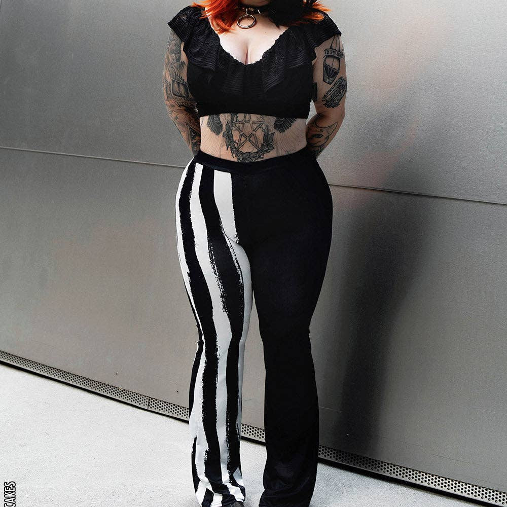 Embrace the unconventional with these enchanting striped flares, where dark mystique meets bold pattern play. Featuring a striking split design—one leg adorned with hypnotic stripes, the other in pure black—these high-waisted leggings move with your body in buttery-soft comfort. The thick, supportive elastic waistband keeps you grounded while dual side pockets offer practical magic. Crafted from a luxurious polyester-spandex blend, they stretch and breathe with every step. Perfect for those who walk the line between light and shadow.