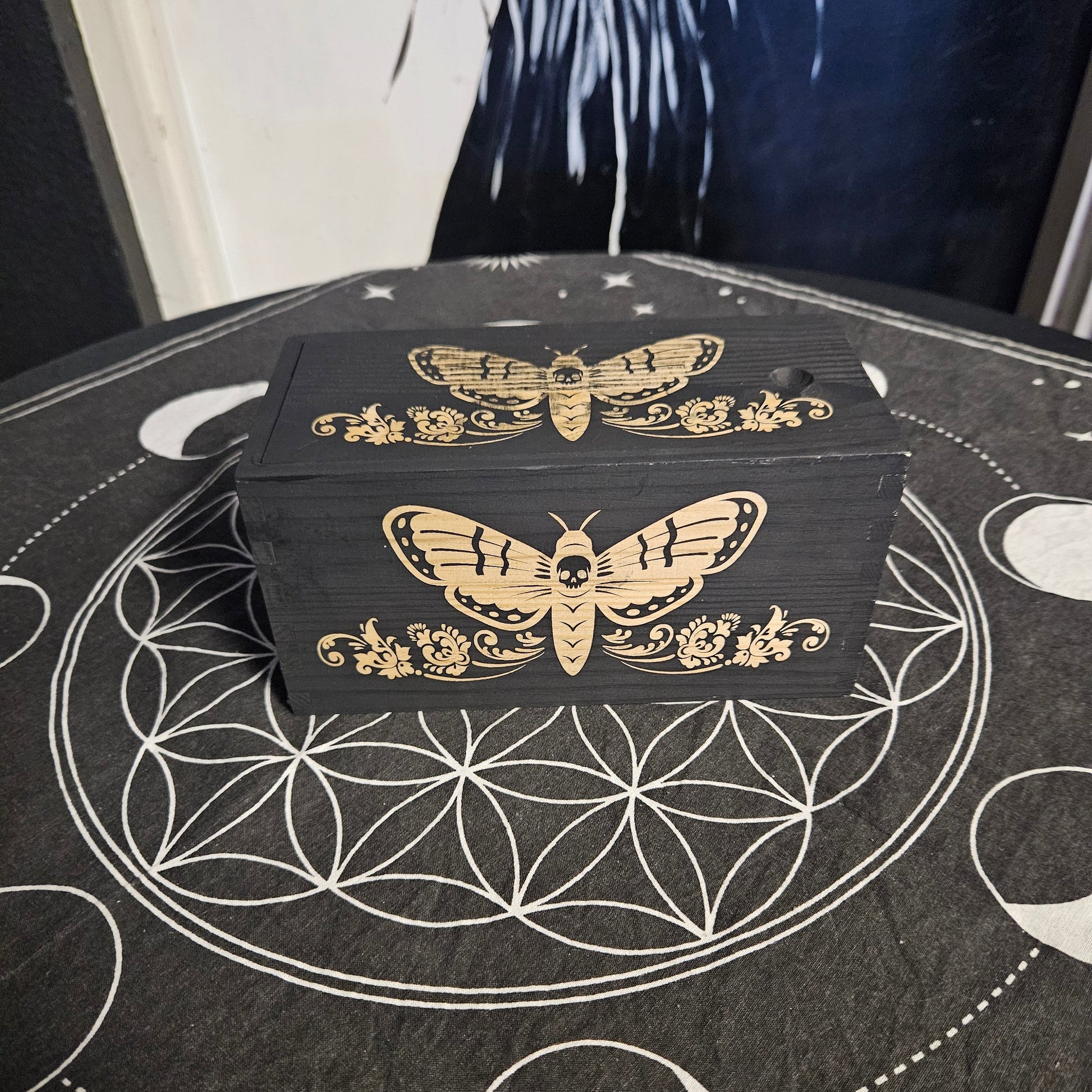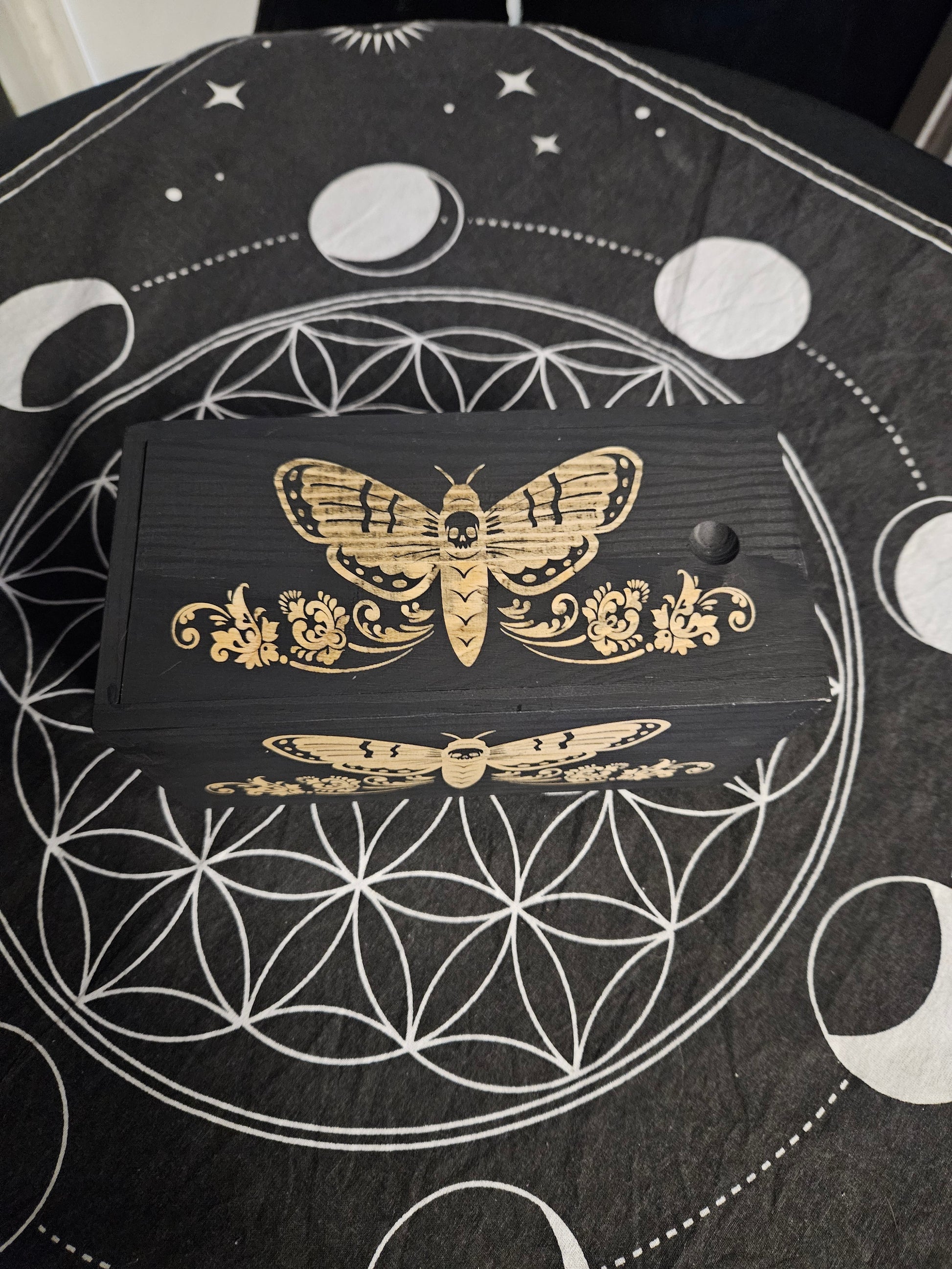 Enhance your mystical practice with the Witch Box. These 7.87" x 3.94" x 3.15" hand-decorated boxes feature a sliding lid for easy access. Each box is hand painted and adorned engraved with different designs perfect for storing tarot decks, crystals, herbs, and other magical tools.