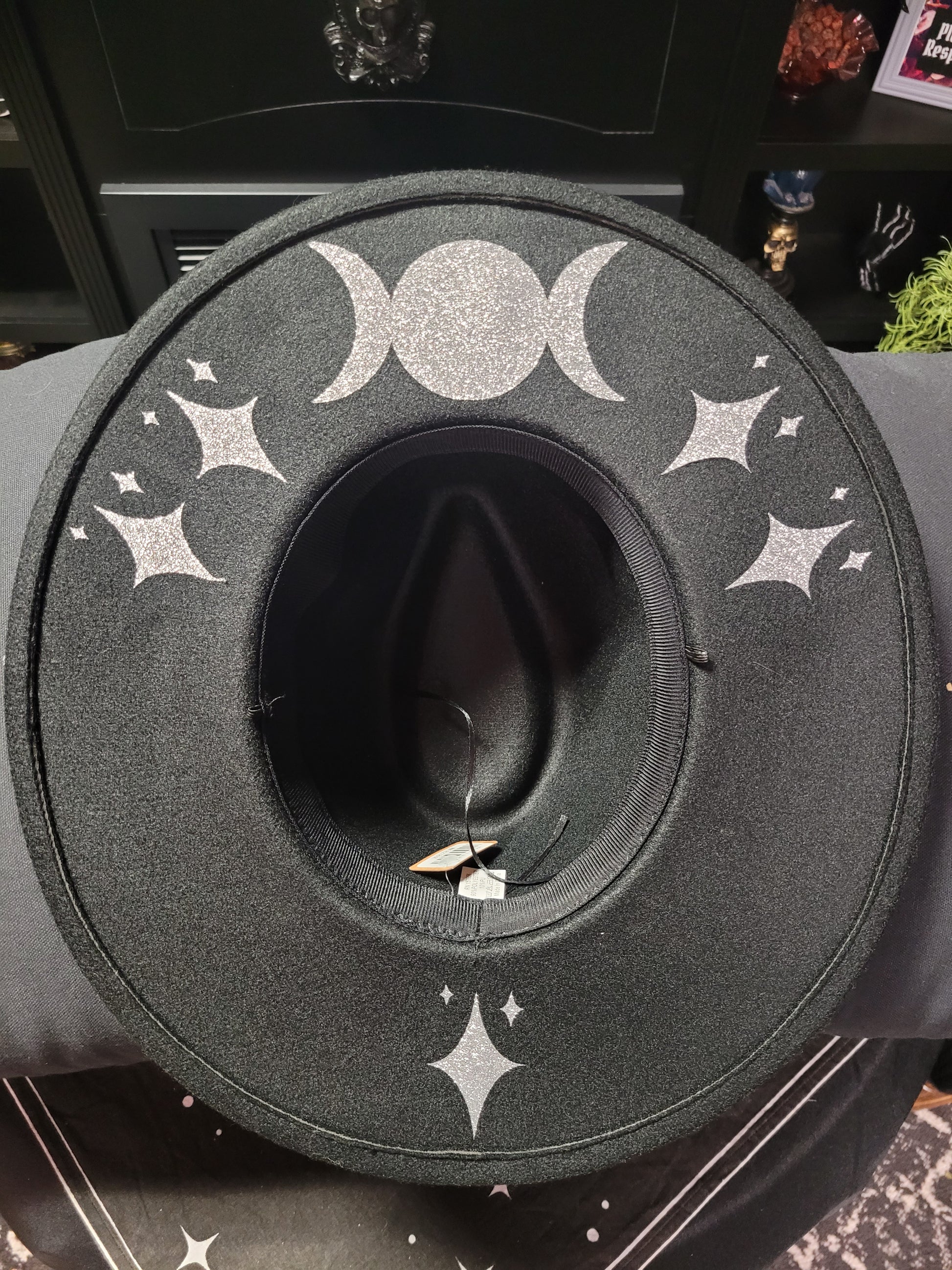 The Triple Moon Wide Brim Hat features a striking white glitter design of the triple moon and starburst on soft faux suede. This mystical accessory combines celestial symbolism with elegant craftsmanship, making it perfect for those who want to channel cosmic energy while enjoying stylish sun protection.