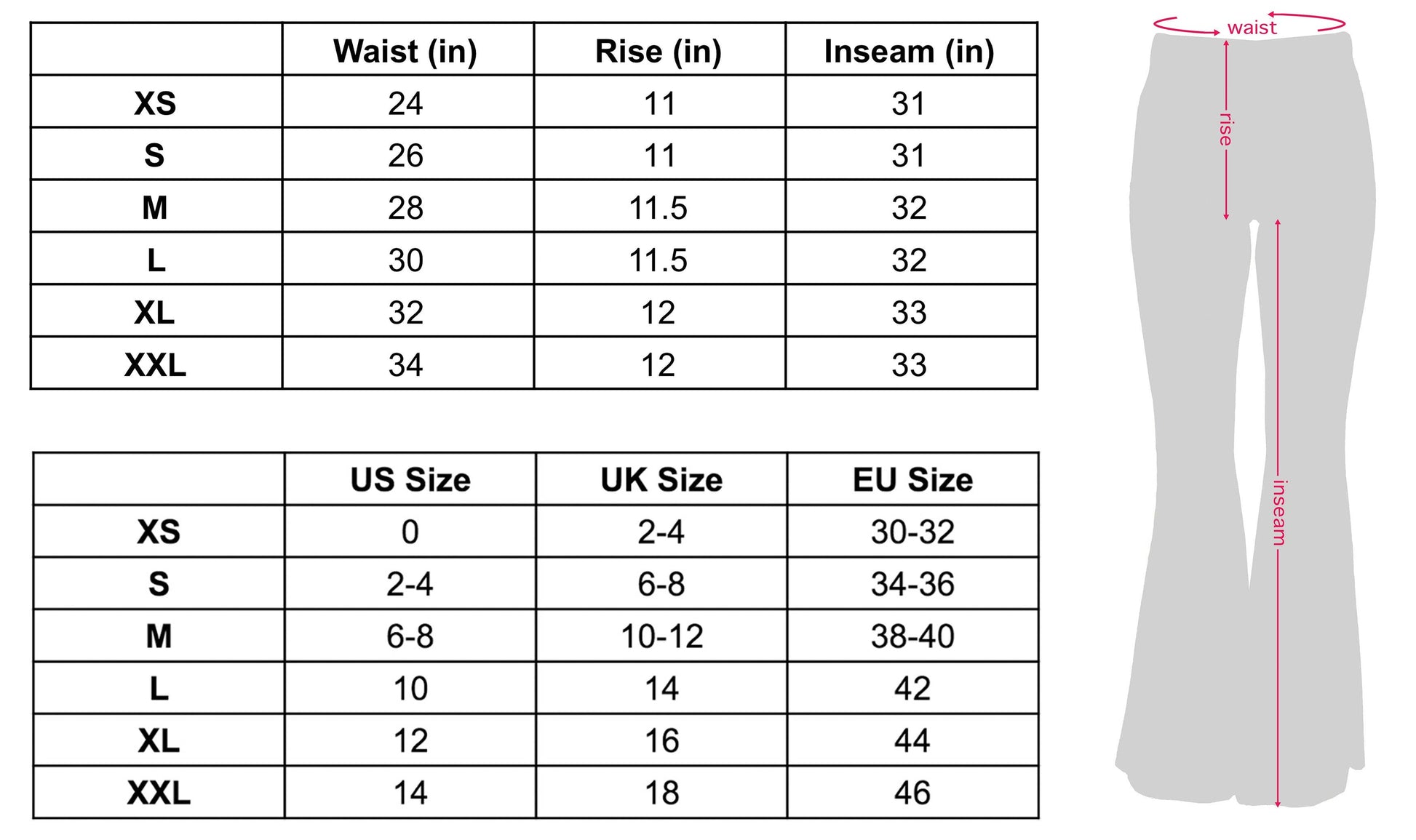 Garment Measurements: XS: Waist 24" Rise 11" Inseam 31” S: Waist 26" Rise 11" Inseam 31” M: Waist 28” Rise 11.5" Inseam 32” L: Waist 30” Rise 11.5" Inseam 32” XL: Waist 32” Rise 12" Inseam 33” XXL: Waist 34” Rise 12" Inseam 33” Model Measurements: Bust 32" Waist 25" Hips 35" Height 5'5 Model is wearing size XS. Fabric: 95% Polyester 5% Spandex